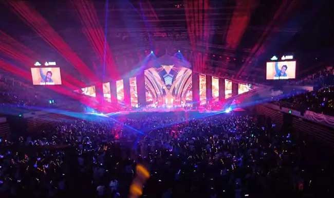 产品案例二:深圳湾体育中心“金曲歌王”萧敬腾演唱会--此项目舞台背景屏联诚发镂空屏P6.944,整体面积1000平方,庞大的舞台制作规模,根据舞台造型多样化搭建,利用屏体自身通透、轻薄、炫彩特点,强化舞台空间的纵向视觉效果。同时完全不阻碍舞台设计留给灯光悬挂和发挥的空间,给整个舞台渲染了一定的气氛和动感。