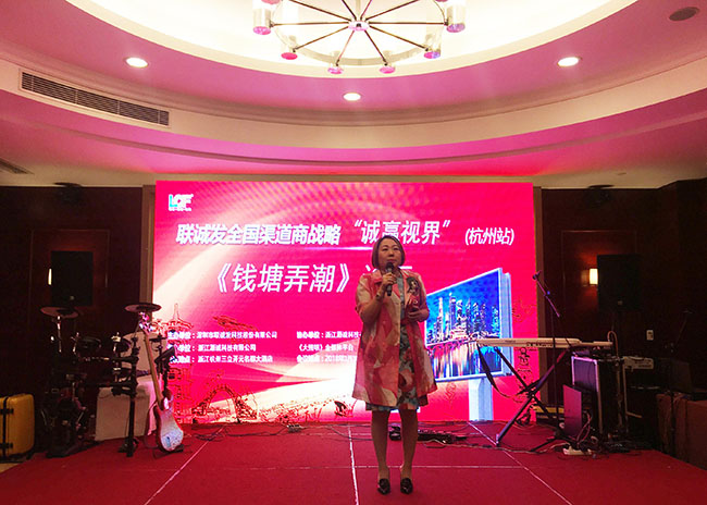 此时,距离联诚发渠道联盟第一站——(郑州)站“逐鹿中原”过去不到20天,距离美国ISA国际标识展览过去不到一周,紧凑的布局之下,依然吸引了众多华东当地LED渠道商、工程商踊跃参与,联诚发创始人龙平芳女士、中国LED工程商联盟秘书长曹立新先生、温州市半导体光电行业协会会长张裕先生等相关领导出席晚宴并作出精彩致辞。