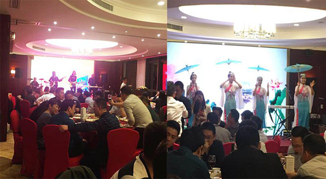 在随后的歌舞表演中,演员们为大家倾情演出,载歌载舞,引人入胜。在满座宾客把酒言欢、觥筹交错之间,联诚发创始人龙平芳女士携公司业务团队,浙江灏诚科技执行董事袁晓澜先生携业务团队,联诚发华中渠道商郑州世杰光电董事长田世杰先生、华北渠道商山西华龙光电总经理余浩先生一起合唱联诚发企业歌曲《晶彩》,将联谊会气氛推至高潮……