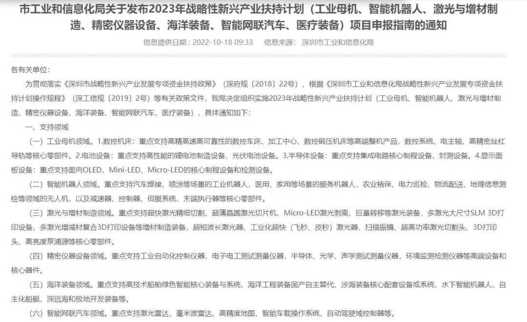 10月18日,深圳市工业和信息化局发布2023年战略性新兴产业扶持计划项目申报通知。最新的扶持计划覆盖产业领域包括工业母机、智能机器人、激光与增材制造、精密仪器设备、海洋装备、智能网联汽车、医疗装备。