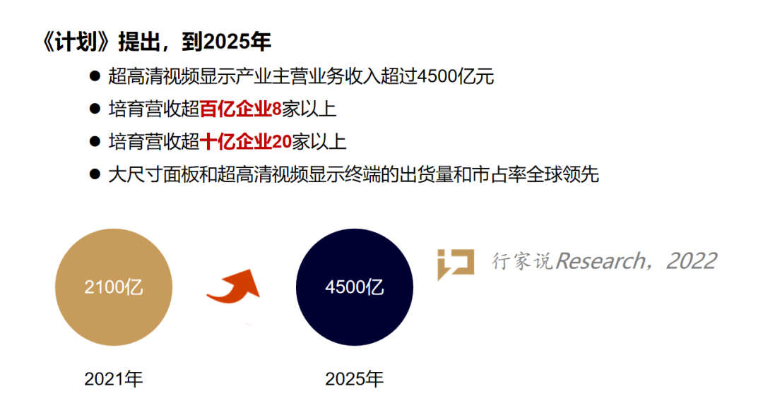 《计划》提出,到2025年,超高清视频显示产业主营业务收入超过4500亿元,培育营收超百亿企业8家以上、营收超十亿企业20家以上,大尺寸面板和超高清视频显示终端的出货量和市占率全球领先。