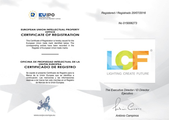 2016.11.09,联诚发“LCF”商标通过了欧盟商标委会员的审核,正式通过申请并核发了商标注册证书,“LCF”通过了第9类、第11类、第35类的商标注册,标志着“LCF”向国际知名品牌的目标又有了一个历名性的飞跃,为“LCF”品牌在欧洲市场起到了更为全面的保护。