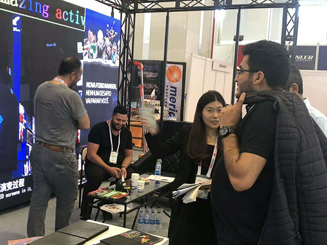 联诚发工作人员向现场的客商重点推荐了公司2018年欧洲主推的租赁产品 P3/P3.91 及球场屏P8/P10系列,作为租赁产品,便捷操作自然是第一需求,联诚发租赁系列重量轻、结构薄,有吊装和快捷安装功能,适应舞台租赁造型多变的客户需求。画质惊艳的视觉体验、人屏互动的交互体验和优良独特实用的产品特点让前来参展的客户频频点赞。而球场屏一直是联诚发业绩来源的一大支柱,每年,总会有客商通过各种方式与联诚发确定关于球场屏的合作关系,目前,联诚发产品已在欧洲33个球协备案,是欧洲足协合格供应商。