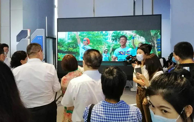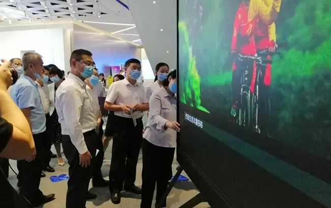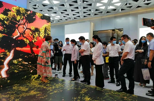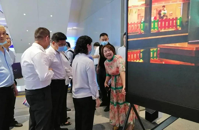 联诚发总裁龙平芳女士亲自向各位领导讲解了联诚发的企业定位,以及现场的两款核心产品;其中之一,“沉浸式互动视觉场景”是基于LED显示屏+3D互动数字技术,形成沉浸式视觉场景,主要应用与电影拍摄,文旅,夜游等领域;实现这种沉浸式显示体验,除了需要高端的屏幕显示技术,亦需要内容产业能够提供充分的制作、计算和存储能力。它融合了VR/AR、计算机多媒体技术,视觉内容,呈现新的“显示概念高地”。宝安区郭子平区长现场表示“想不到航城还有这样的好企业,要好好支持!”